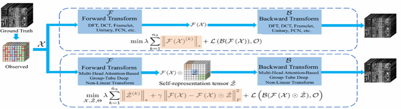 该论文提出了一种基于深度低秩张量自表示的多维图像复原方法。在张量奇异值分解框架下,既有的基于线性/非线性变换的张量核范数极小化方法只能捕捉全局低秩结构(单一子空间),然而真实的多维数据常常分布于多个子空间或子流形中。该工作首先在张量奇异值分解框架下提出一种基于多头注意力的深度非线性变换,能够同时捕获局部与长程依赖,同时在深度变换域中构建自表示张量并极小化其核范数,从而更加精确地刻画多子空间(或子流形)结构。该方法在多类多维图像复原任务中达到当前最佳性能。