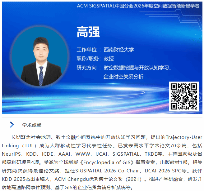 作为90后青年学术骨干,高强教授长期深耕社会地理与数字金融空间的开放认知学习问题,其提出的Trajectory-User Linking(TUL)成为人群移动性学习代表性任务。他的研究紧密围绕时空数据挖掘与开放认知学习、企业时空关系分析等前沿方向,迄今已在NeurIPS、KDD、ICDE、AAAI、WWW、IJCAI、ACM SIGSPATIAL、TKDE等顶级会议与期刊发表高水平学术论文70余篇。主持国家级及省部级科研项目4项。受邀为全球新版《Encyclopedia of GIS》撰写专章,出版教材1部,相关研究两次获得最佳论文奖。担任SIGSPATIAL 2026 Co-Chair、IJCAI 2026 SPC等。获评KDD 2025杰出审稿人,ACM Chengdu优秀博士论文奖(2021)。推进产学研融合,研发并落地高速路网事件预测、基于GIS的企业信贷营销分析系统等。